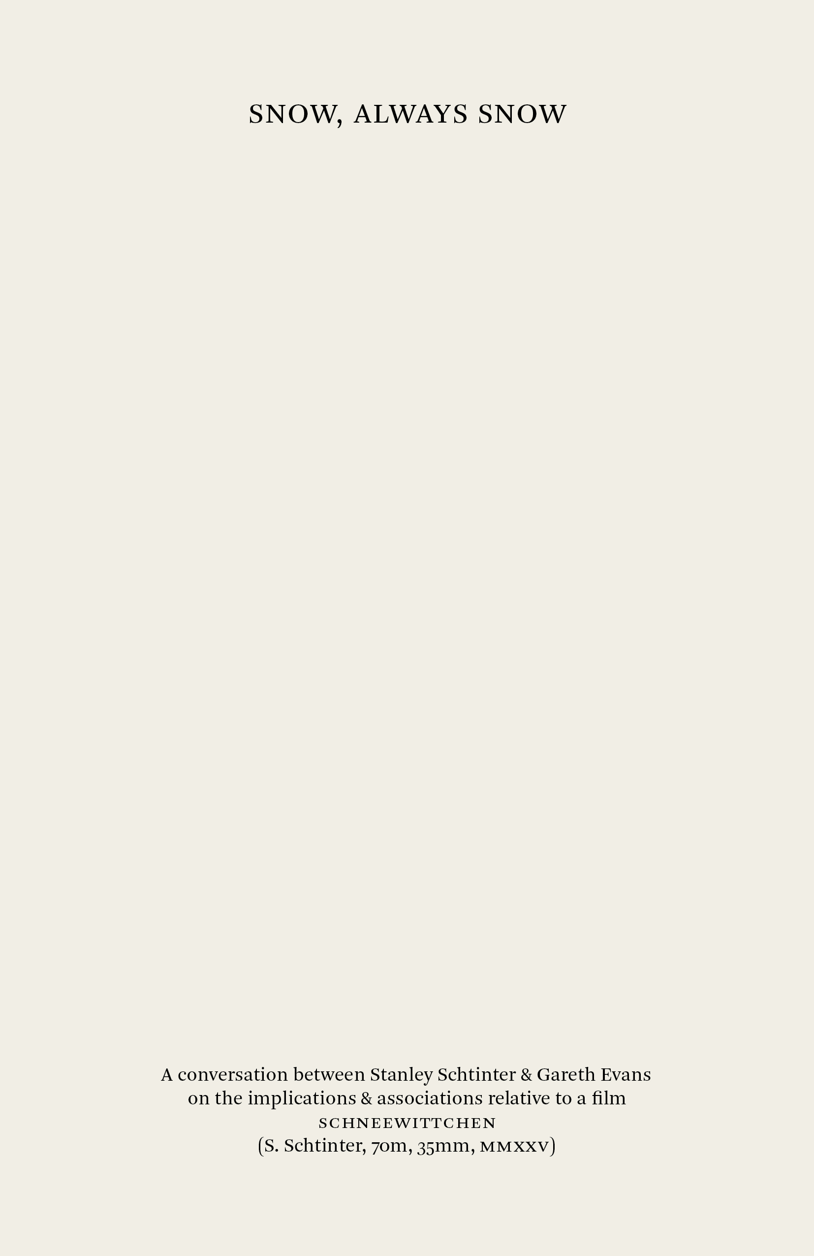 Schtinter’s newest moving-image work is Schneewittchen, 2025, a feature-length, palimpsestic retelling of Snow White. The film features almost no footage and is instead centred on an English-language audio recording of the Swiss writer Robert Walser's titular German play (published in 1901), itself a reworking of the Brother’s Grimm fairy tale (published in 1812). Schtinter’s film, with its minimal visual content composed largely of a black screen, interspersed with seemingly unrelated shots of passing clouds, is formally also a remake of the Portuguese director João César Monteiro’s feature film, Branca de Neve / Snow White (2000), which performed the same feat with a Portuguese-language version of Walser’s play. A remake of a remake of a remake, then. While on the surface another puckish engagement with cultural production, Schtinter’s film nevertheless functions as both a challenge to the culture industry’s amnesiac thirst for endless remakes of commercial dross and as a kind of Brechtian confrontation with the spectacular expectations imposed on a patronised viewing public (the two are intimately bound up with each other). The project further frustrates the conventions of easy access required of moving image works, which must now be available for dissemination in a myriad of digital forms, many of which make it at least feasible for the viewing public to watch works as isolated individuals in their own homes. Schtinter's film will, according to the artist, ‘only ever show in analogue format, so it will always be an event to travel to and never streaming or screening digitally.’ For Schtinter, the political power of collective viewing is something worth fighting for.