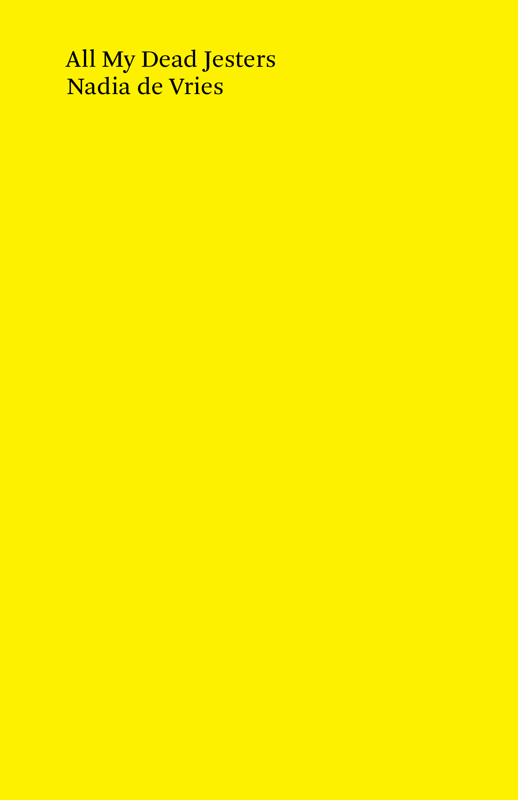 All My Dead Jesters is an assembly of select poems previously published in de Vries’ first two English language collections—Dark Hour and I Failed to Swoon (Dostoyevsky Wannabe, 2018 and 2021 respectively). These old works have been lightly revised for republication, and are paired with poems drawn from a manuscript-in-process to institute an autotelic kaleidoscope of some ten years worth of work in verse.